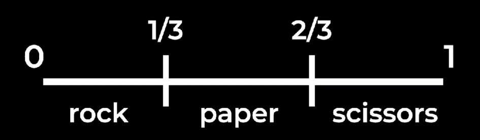 Hierboven is een afbeelding van de logica achter de code. Als de random getal tussen de 0 en 1/3 van 1 valt, wordt de keuze van de computer “rock”. Dit geldt ook voor de andere keuzes. Als we nu naar mijn code kijken, gebruik ik een if-statement om te checken in welke stuk de random gegenereerde getal valt. Als deze getal bijvoorbeeld groter is dan 1/3 van 1 en kleiner is dan 2/3 van 1, dan wordt de keuze opgeslagen in de variabel “computerMove” en gebruikt bij de functie “playGame”.