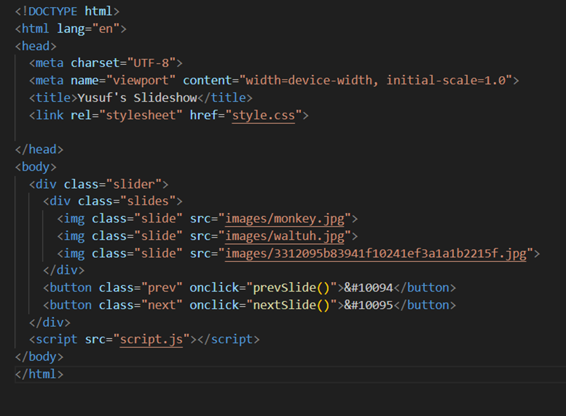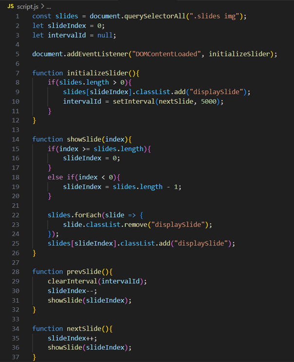 Met document.querySelectorAll(".slides img") worden alle afbeeldingen in de div-container opgehaald en opgeslagen in de variabel slides. Vervolgens wordt er bijgehouden bij welke afbeelding we ons bevinden (slideIndex). Er wordt ook een intervalId gemaakt, die gebruikt wordt voor de automatische overgang van de afbeeldingen.