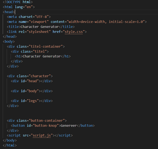 Bij deze Karakter generator kan je op de button “genereer” klikken, waardoor de afbeeldingen in de div-elementen willekeurig worden aangepast. Hierdoor krijg je elke keer een andere karakter met een grappig effect.