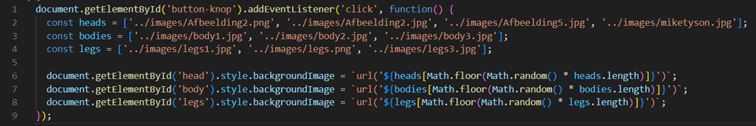 Als eerste wordt er een functie uitgevoerd, wanneer er op de button wordt geklikt met de Id “button-knop”. Vervolgens zien we dat er 3 arrays worden aangemaakt waar alle afbeeldingen worden opgeslagen van de hoofden, lichamen en benen.