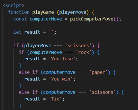 Om de keuze van de computer te beslissen, is er een aparte functie aangemaakt die math.random gebruikt om elke keer een andere keuze van de computer te krijgen. Deze keuze wordt opgeslagen in een constante variabel genaamd computerMove. Verder is er een lege variabel aangemaakt waar de resultaat van het spel wordt opgeslagen. Hierboven zien we dat aan de hand van een grote if-statement eerst wordt gekeken wat de keuze is van de speler. Als de keuze van de speler bijvoorbeeld ‘’scissors’’ is, wordt daarna de keuze van de computer vergeleken met “scissors”. Aan het einde wordt het resultaat geüpdatet in de variabel result.