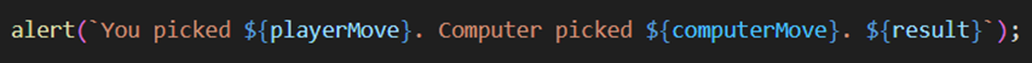 Om een pop-up te krijgen wanneer er op een knop wordt geklikt, heb ik gebruik gemaakt van de alert-functie. Binnen deze functie wordt de zin elke keer aangepast aan de hand van de keuzes/resultaten die zijn gemaakt en geüpdatet met ${} (expressie-interpolatie).
