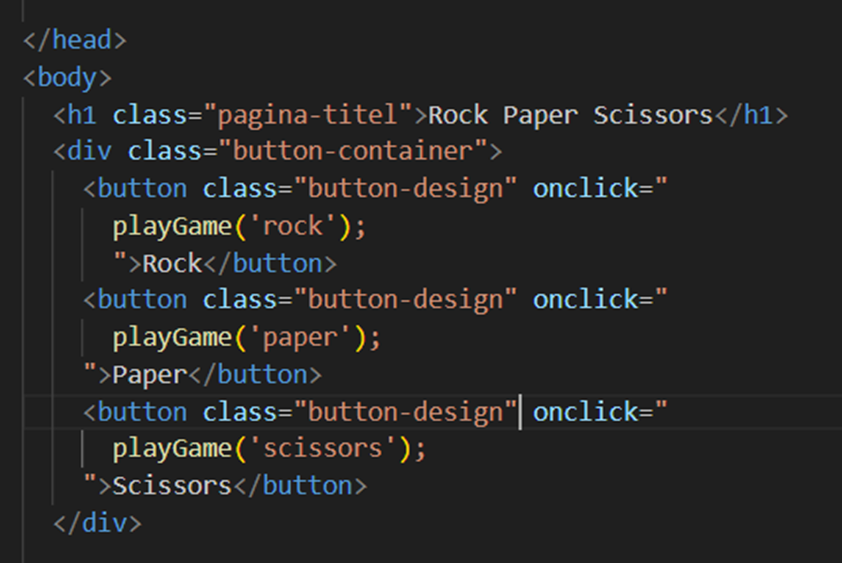Ik heb 3 buttons aangemaakt met een Onclick event handler en binnen deze event-handler zit een functie genaamd “playGame”. Bij deze Functie hoort een parameter dat de keuze van de speler moet voorstellen.