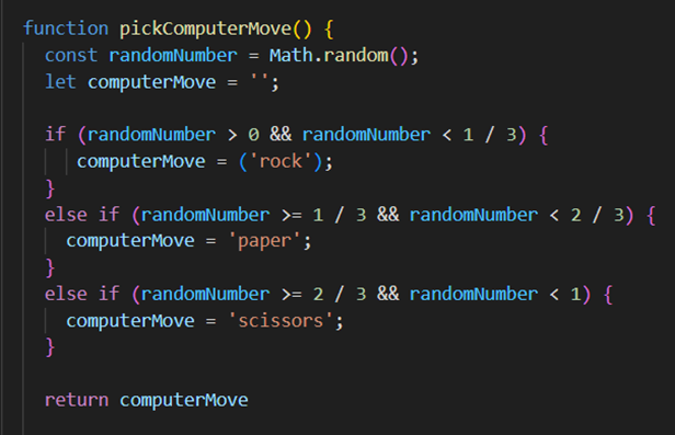 Hierboven is een afbeelding van de logica achter de code. Als de random getal tussen de 0 en 1/3 van 1 valt, wordt de keuze van de computer “rock”. Dit geldt ook voor de andere keuzes. Als we nu naar mijn code kijken, gebruik ik een if-statement om te checken in welke stuk de random gegenereerde getal valt. Als deze getal bijvoorbeeld groter is dan 1/3 van 1 en kleiner is dan 2/3 van 1, dan wordt de keuze opgeslagen in de variabel “computerMove” en gebruikt bij de functie “playGame”.